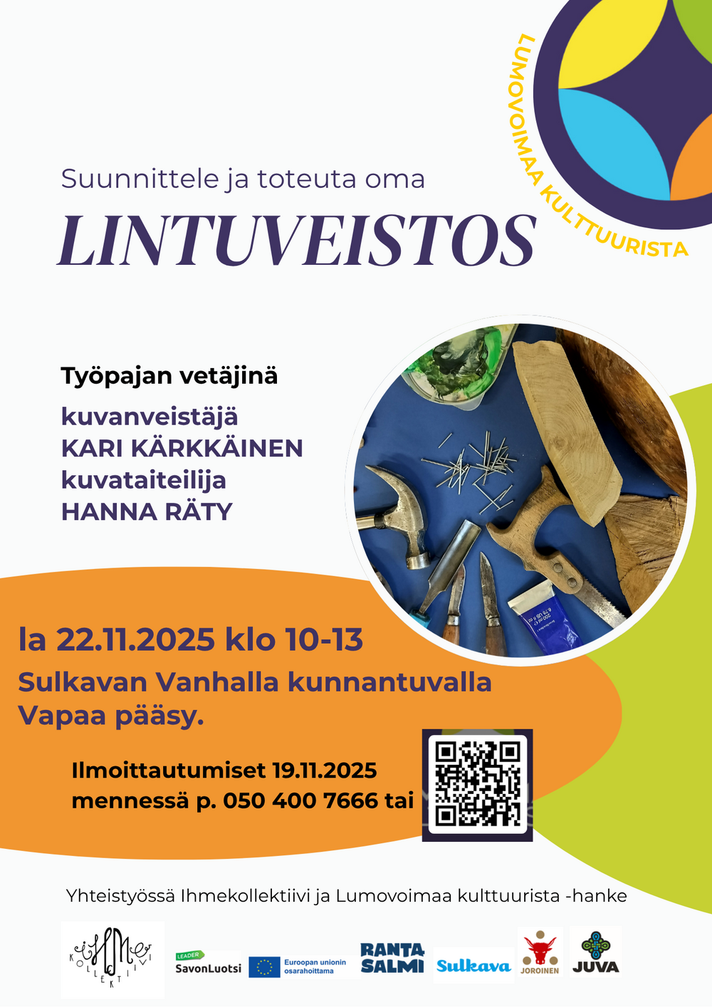 Lintuveistos -työpajassa toteutetaan pienehköt lintuveistokset. Päämateriaalina käytetään puuta, mitä työstetään eri työkaluilla, nauloilla ja ruuveilla sekä maalaamalla akryyliväreillä. Lähtökohtana…